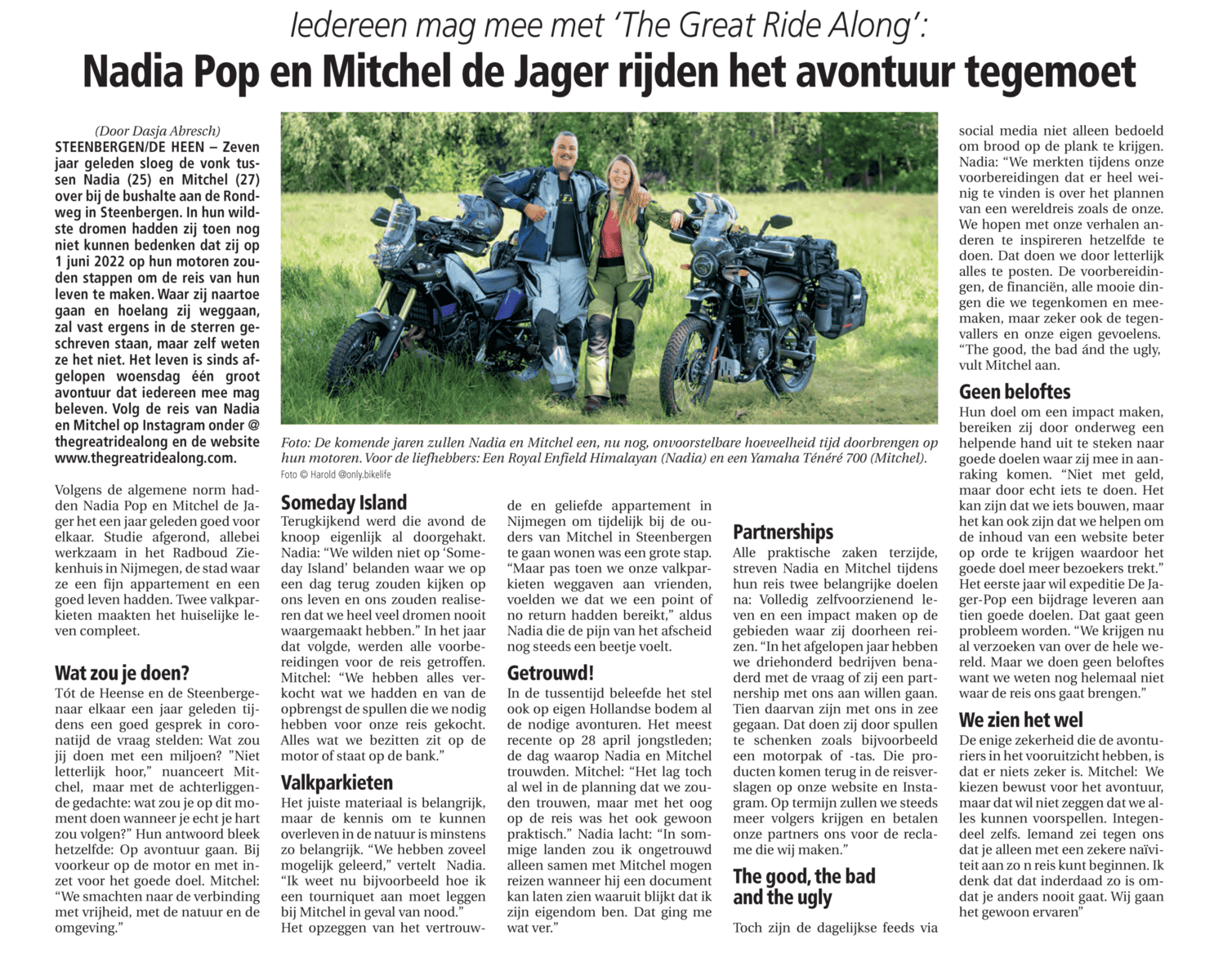 Featured in Steenbergse Courant Play Pause Unmute Mute In the edition of Friday, June 3rd, 2022, we were interviewed by the Steenbergse Courant about our upcoming journey. Share: Facebook X